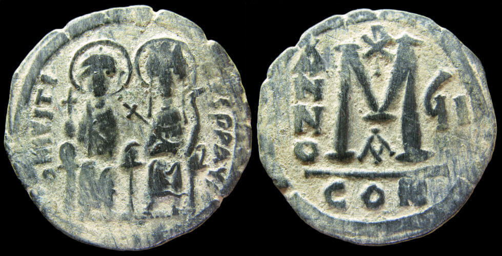 Superbe follis byzantin frappé sous Justin II et Sophie, marqué de l’année de règne 6 (570/571). L’association impériale du couple sur le trône symbolise la continuité du pouvoir et la stabilité dynastique de la période post-justinienne. Cette émission de Constantinople illustre le style raffiné et la solennité des représentations impériales du VIe siècle.