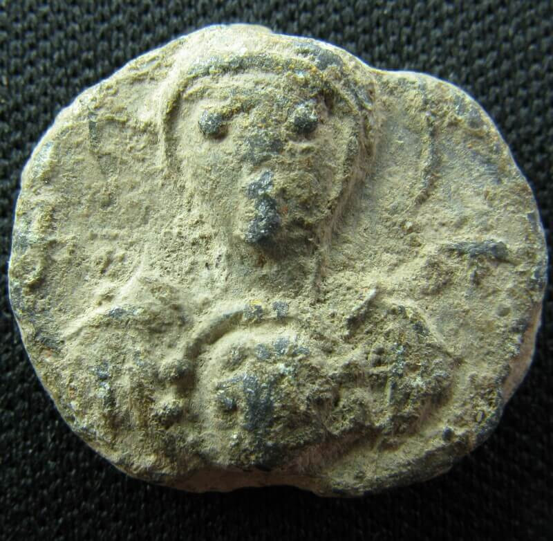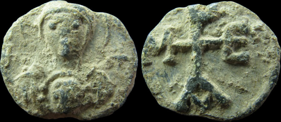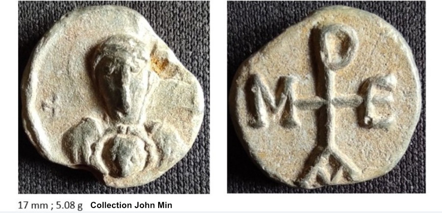 Sceau au flan légèrement irrégulier (15 × 17 mm), dont la facture s'inscrit dans les productions de plomb byzantines de la fin du VIᵉ ou du début du VIIᵉ siècle. Le droit présente la Vierge nimbée tenant le médaillon du Christ bénissant, encadrée de croix — type iconographique bien attesté dans la sigillographie protobyzantine, dont des parallèles typologiques sont fournis par le lot 2654 de la vente Gerhard Hirsch Nachfolger (Auction 271) et par un exemplaire de la collection John Min.