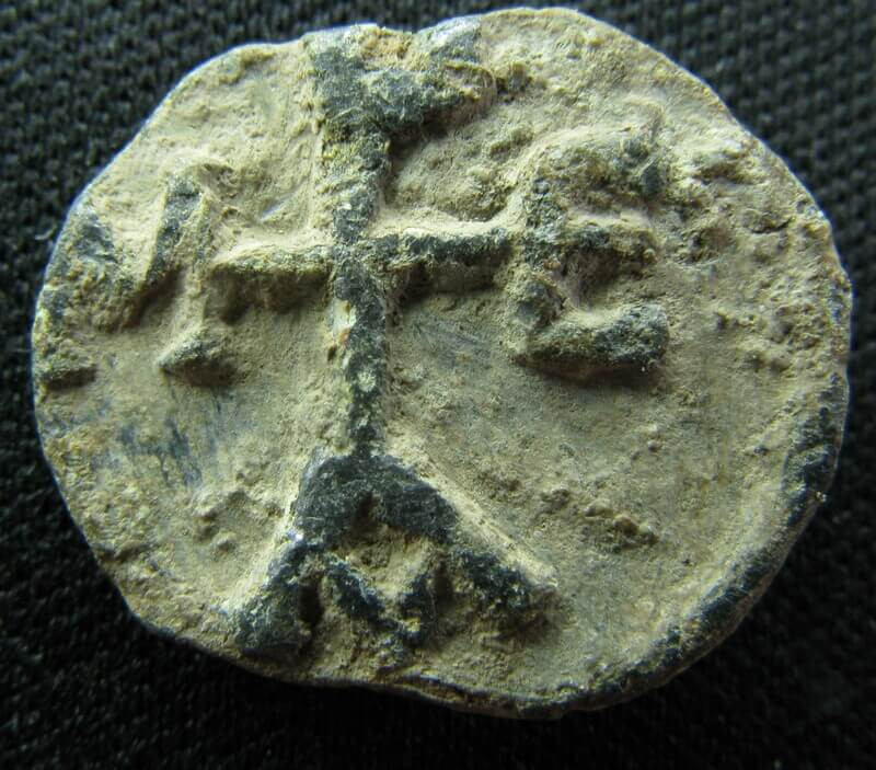 R/ Monogramme cruciforme de lecture incertaine. Lettres partiellement identifiées sur les quatre bras : Μ à gauche ; Ε à droite ; Ρ au-dessus ; Α en bas.