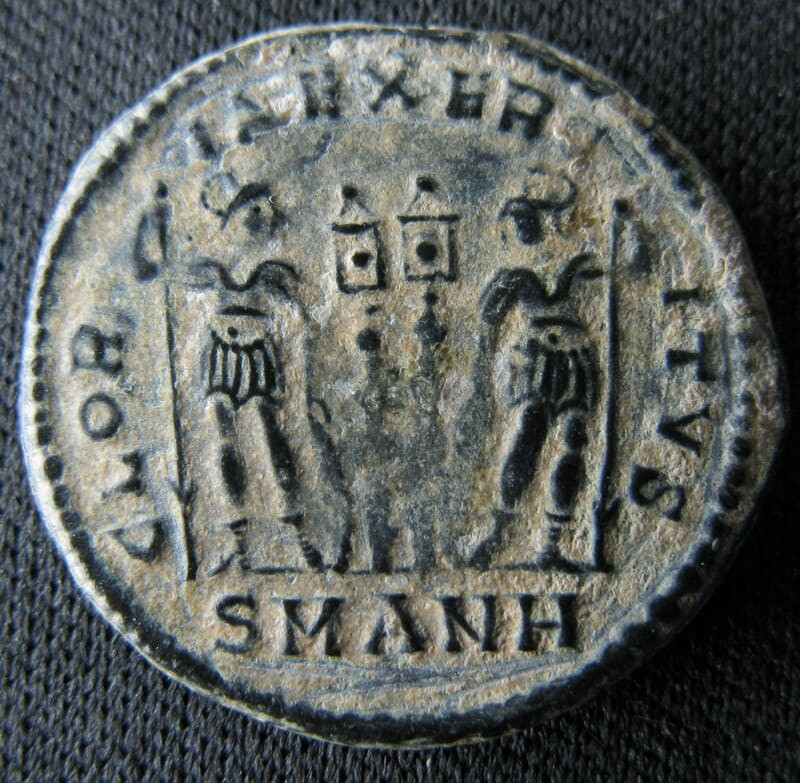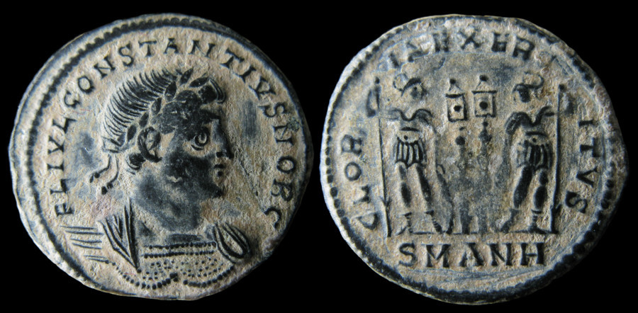 Frappé à Antioche entre 330 et 333 puis encore en 335, ce type illustre pleinement la propagande militaire de la dynastie, au moment où Constance II n’est encore que César. La marque d’atelier SMANZ témoigne de l’importance stratégique des ateliers orientaux dans la diffusion de cette iconographie.