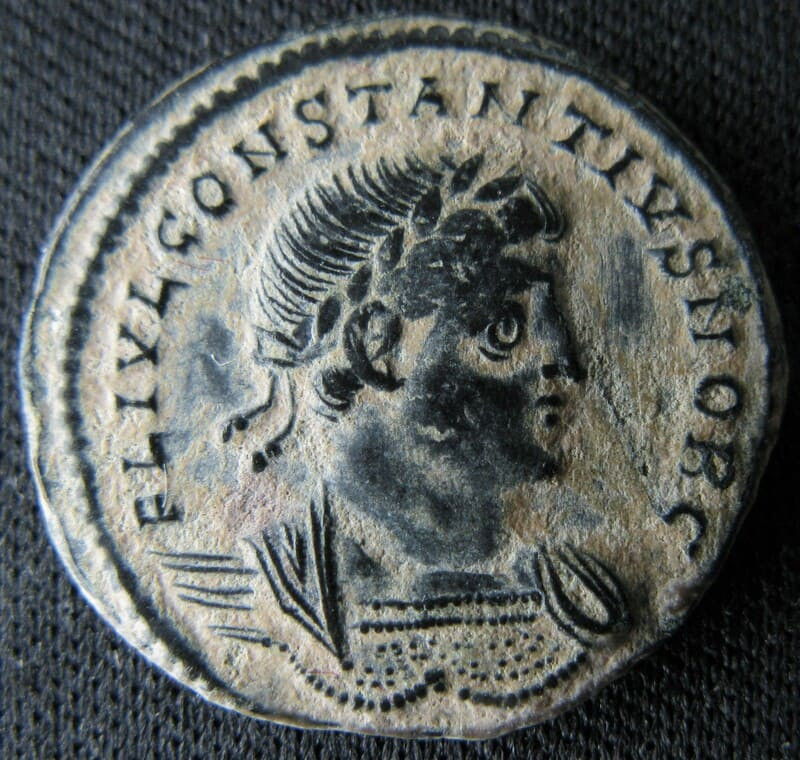 Cet AE3 de Constance II appartient aux premières émissions constantiniennes du type GLORIA EXERCITVS à deux enseignes, un motif plus solennel que la variante à une seule enseigne et visant à renforcer le message d’unité et de discipline de l’armée impériale.