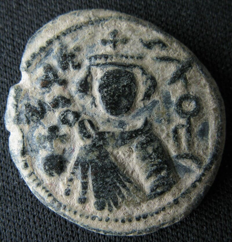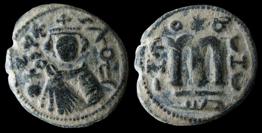 Ce fals arabo-byzantin, frappé à Hims (l’antique Emèse) entre 65 et 86 de l’Hégire, illustre la diffusion régionale des types hérités du monnayage byzantin sous le califat omeyyade. Le buste impérial couronné et le grand M témoignent de la persistance des modèles visuels byzantins, tandis que l’introduction de caractères arabes affirme progressivement l’autorité islamique sur les ateliers syriens.