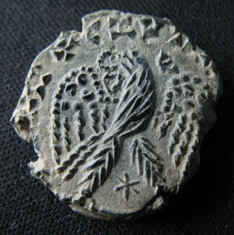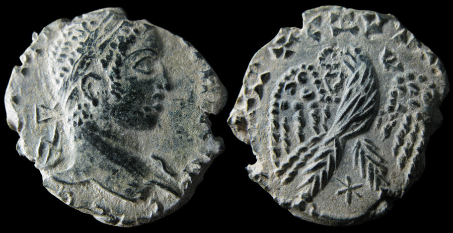 Aigle debout de face, la tête à gauche, tenant une couronne dans le bec ; étoile entre les pattes ; Δ-Є dans les champs.