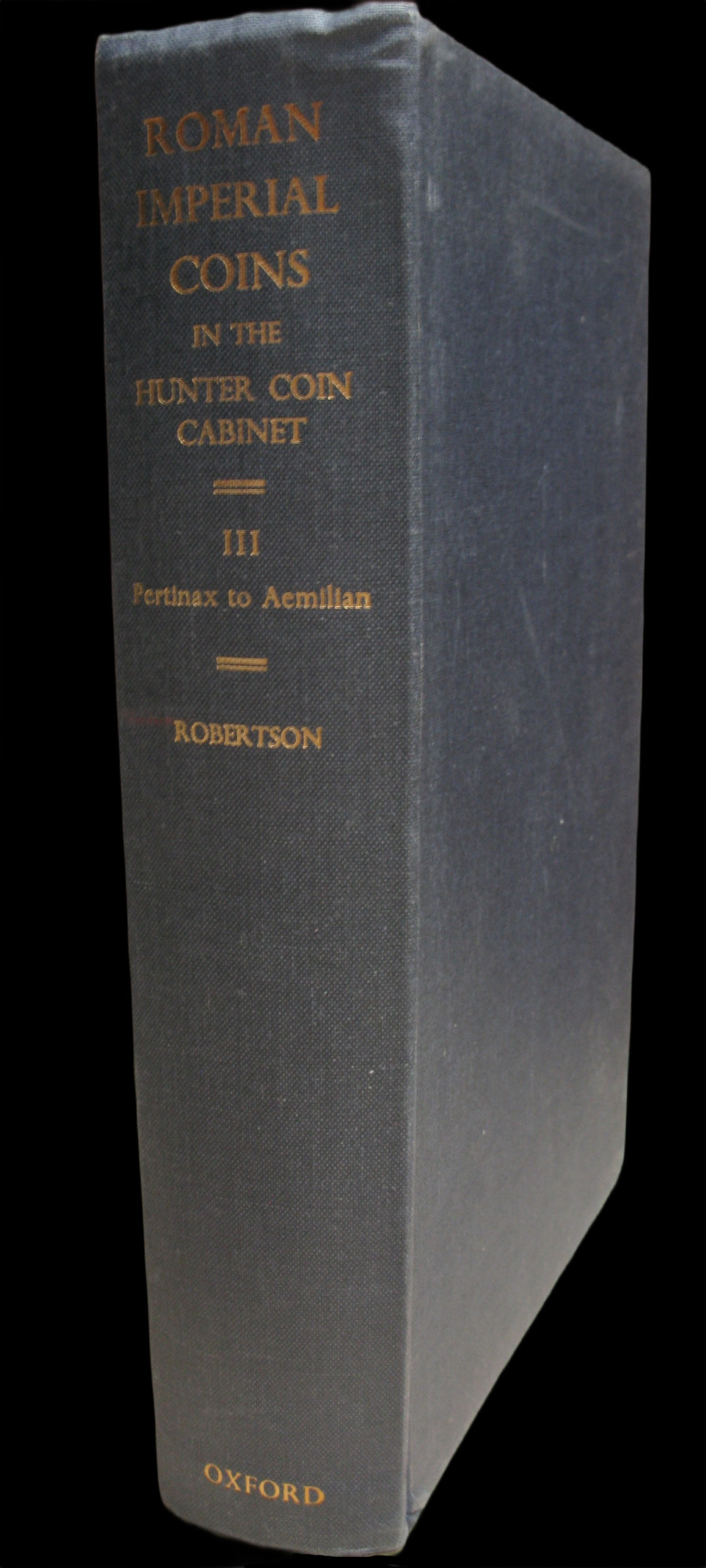 Troisième volume du catalogue monumental des monnaies romaines impériales conservées au Hunterian Museum de l'Université de Glasgow, publié par Oxford University Press. Cet ouvrage couvre une période charnière : de Pertinax (193) à Émilien (253), soit l'intégralité de la crise du IIIe siècle dans sa première phase — Sévères, Gordiens, Philippe l'Arabe, Dèce, Trébonien Galle. Environ 2 000 monnaies répertoriées, dont les deux tiers illustrés en planches.