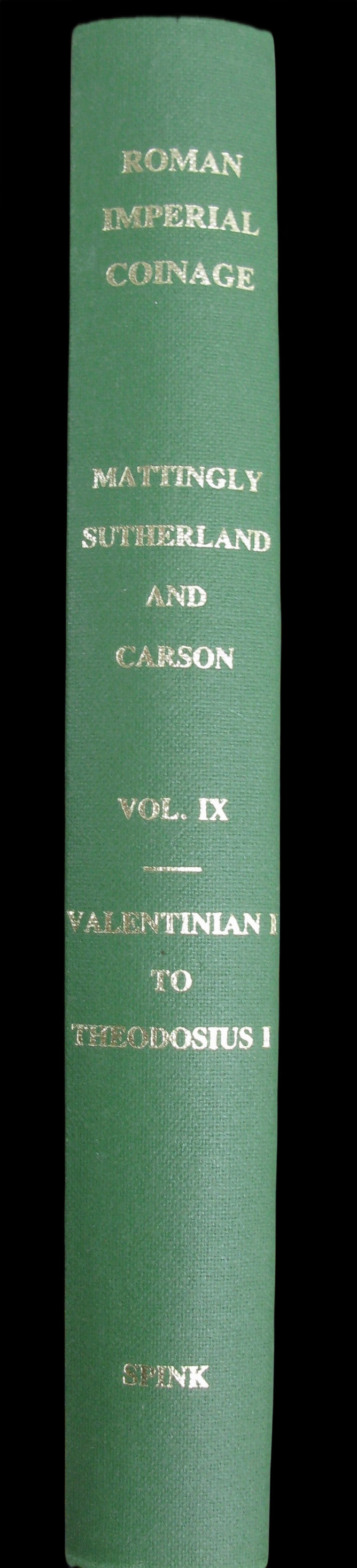 Neuvième volume du Roman Imperial Coinage (RIC), la série de référence universelle pour l'attribution du monnayage impérial romain, commencée en 1923 et achevée en 1994. Ce volume couvre les règnes de Valentinien Ier, Valens, Gratien, Valentinien II et Théodose Ier — soit l'ensemble du monnayage de la seconde moitié du IVe siècle, période charnière avant la division définitive de l'Empire.