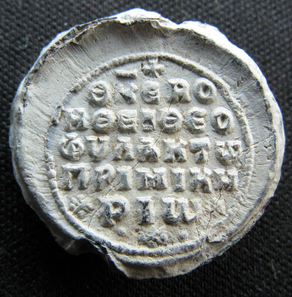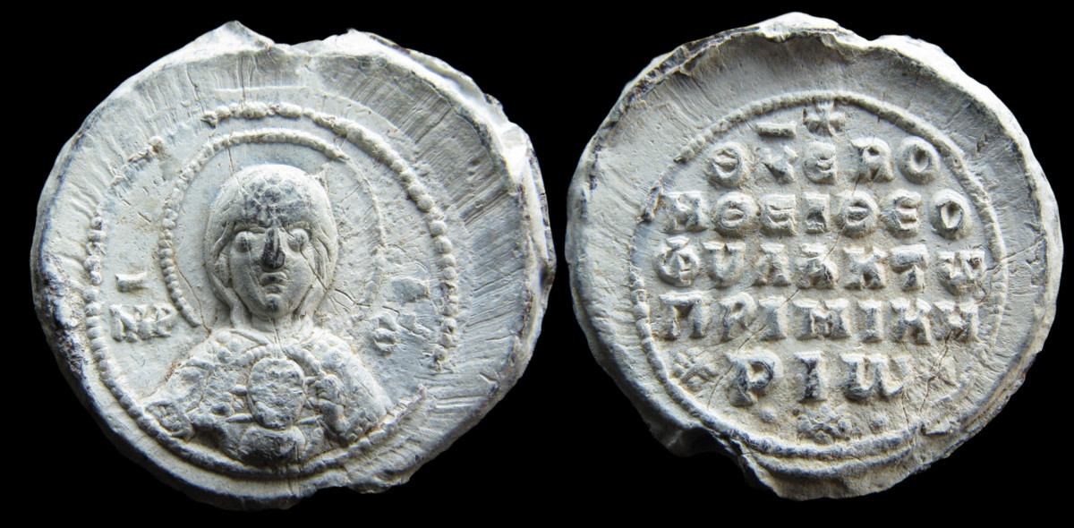 R/ Dans un cercle de grénétis, inscription sur cinq lignes : Θεοτόκε βοήθει τῷ σῷ δούλῳ Θεοφυλάκτῳ πριμικηρίῳ — « Ô Mère de Dieu, aide ton serviteur Théophylacte, le primicier. »