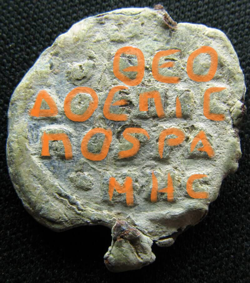 Lecture retenue : Θεοδώ(ρου) ἐπισκ(ό)πο(υ) καὶ ῥαίκ(τωρ)? — « de Théodore, évêque et recteur (?) de (?) ».