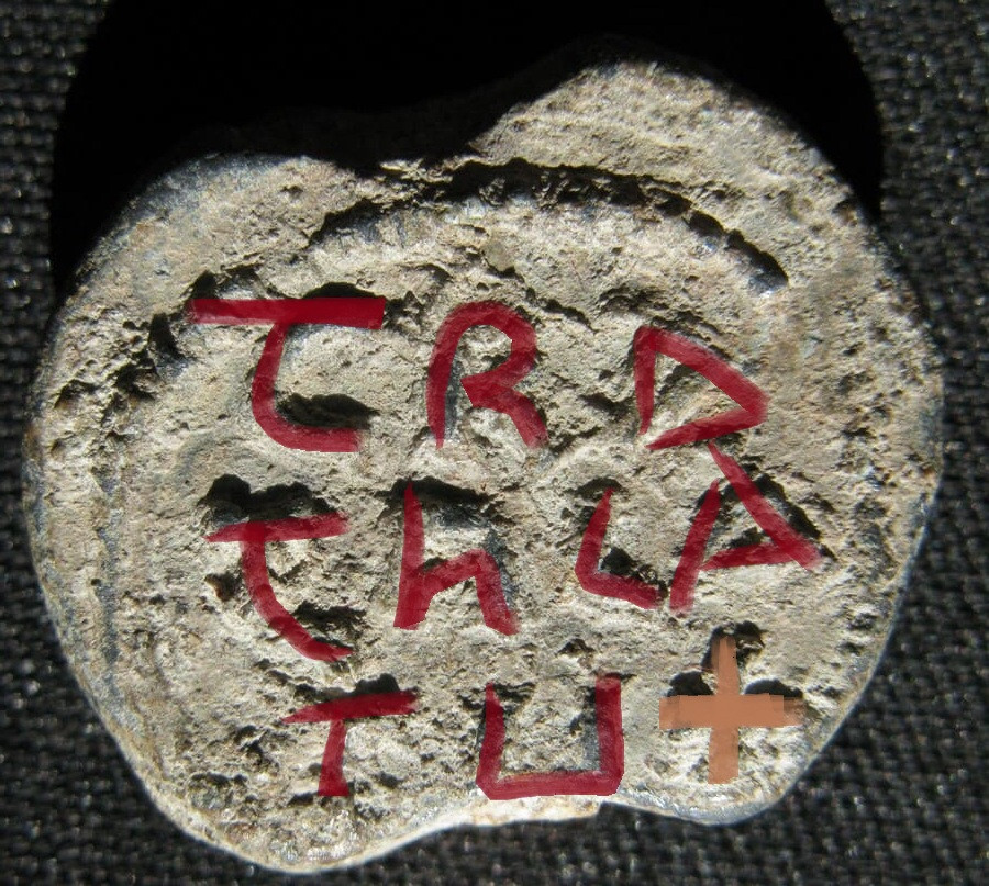 R/ Légende latine sur trois lignes : [+S] / TRA / ThLA / TЧ+. Lecture : STRATHLATV — « stratelate ».