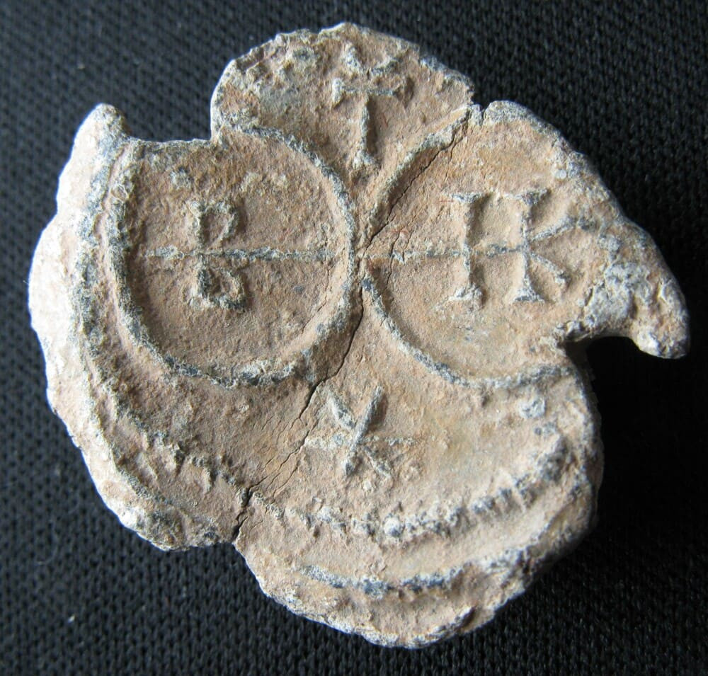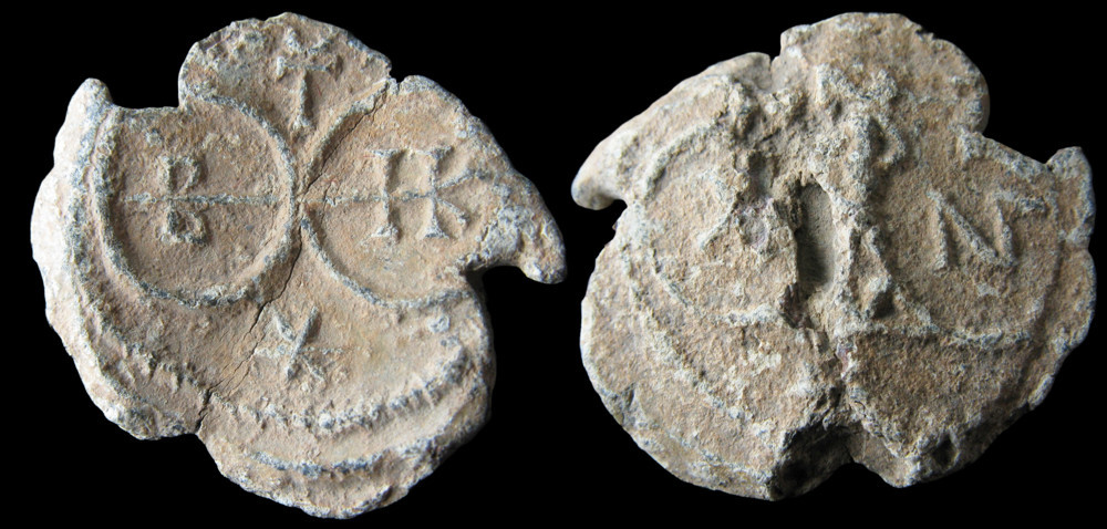 Beau sceau en très bon état de conservation, offrant une lecture complète des deux monogrammes. L'objet s'inscrit dans la production sigillographique militaire des VIIᵉ-VIIIᵉ siècles, période de structuration des commandements de l'armée byzantine à l'issue des réformes thématiques.