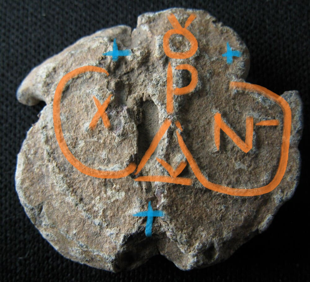 A/ Monogramme invocatoire cruciforme : ΘΕΟΤΟΚΕ ΒΟΗΘΕΙ — développé en θεοτόκε βοήθει, « Theotokos, aide[-le] ».