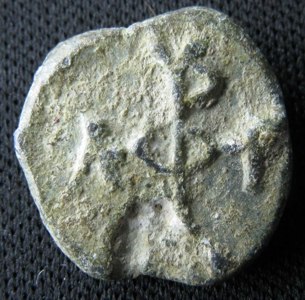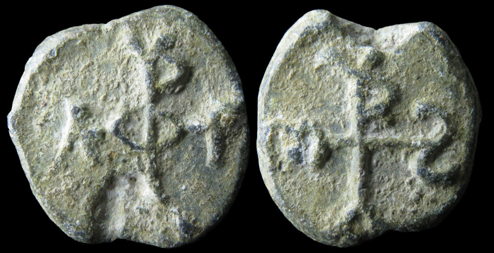 R/ Monogramme cruciforme en caractères latins : M à gauche, S rétrograde à droite, A en bas, R (valant O) au-dessus soutenant un V.