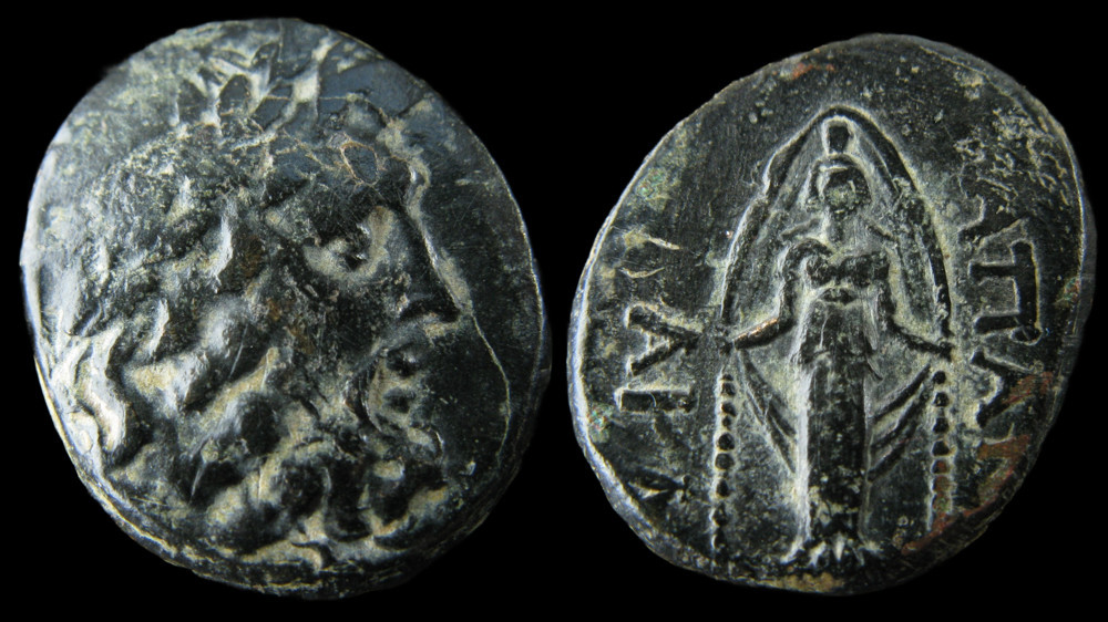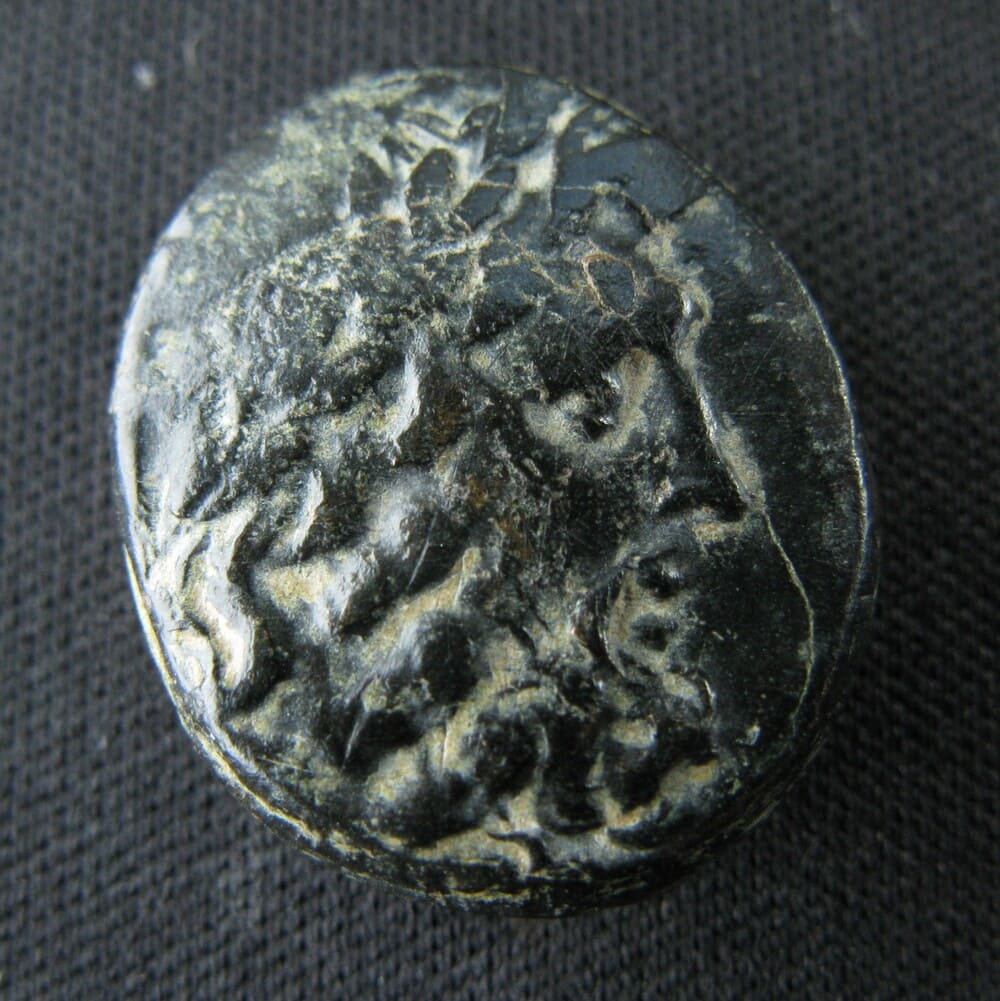 Superbe exemplaire agrémenté d'une belle patine verte, homogène et profonde, particulièrement séduisant en main. La frappe est nette sur les deux faces, avec un portrait de Zeus de belle facture et une statue cultuelle bien détaillée au revers.