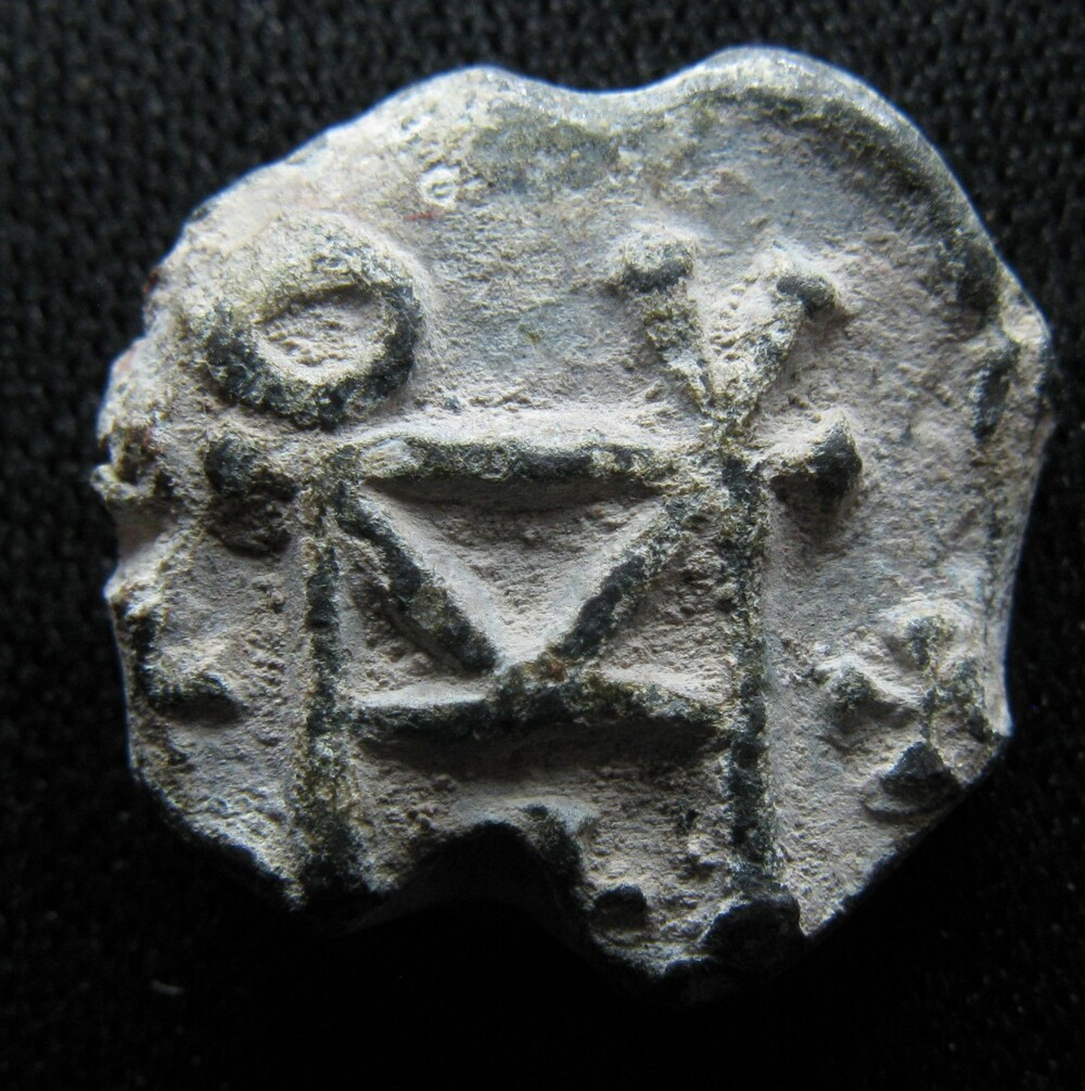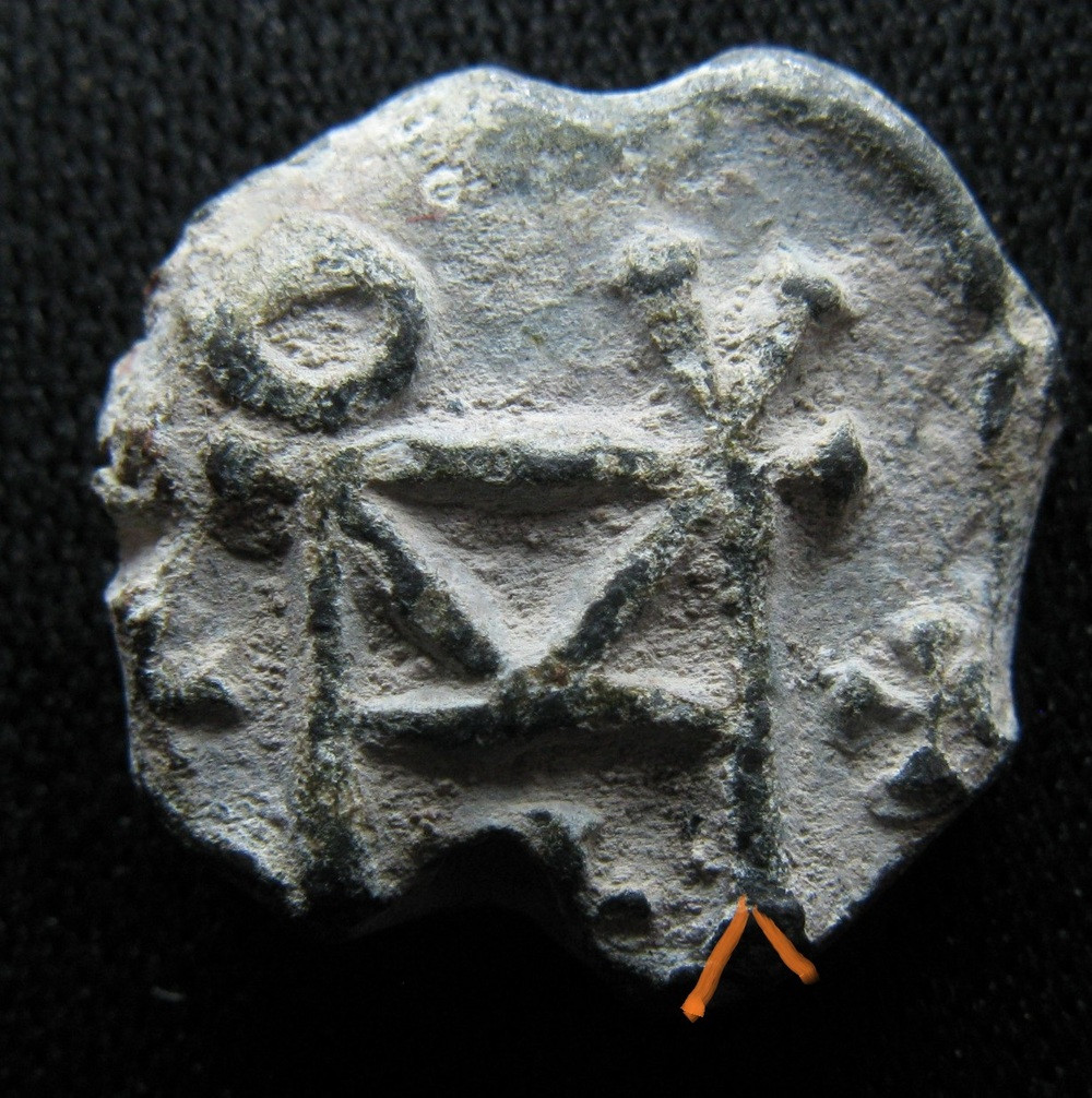 R/ Monogramme en bloc formé sur un Π contenant M et H. Sur la jambe gauche, O (faisant également office de P) ; sur la jambe droite, V. T possible sur les deux jambes. Sous la jambe droite, Λ (peu visible, disposition fréquente sur ce type de monogramme). Croix de part et d'autre et en bas, au centre du Π.