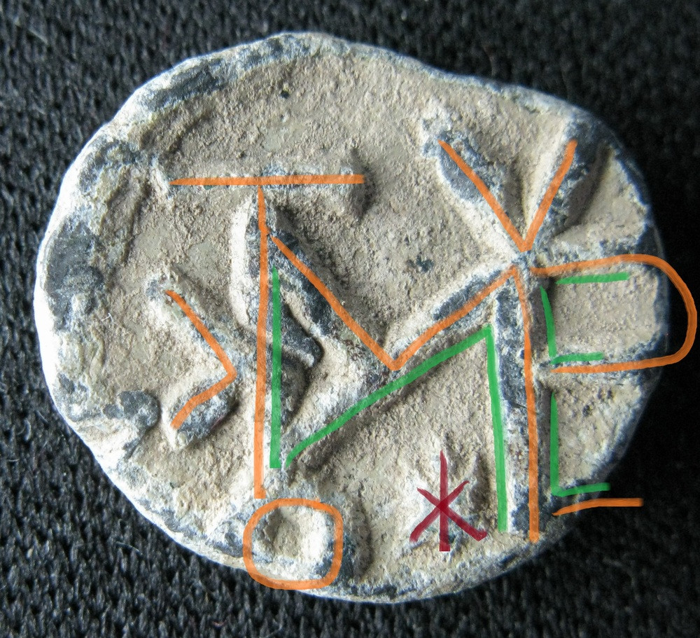 A/ Bloc monogramme construit sur Μ et Ν rétrograde. Κ rétrograde accosté sur la jambe de gauche, celle-ci surmontée d'un Τ et sous elle Ο. La jambe droite est surmontée de V, contient Ε (qui intègre S) et Ρ. Le ω est vraisemblablement sous la jambe droite.