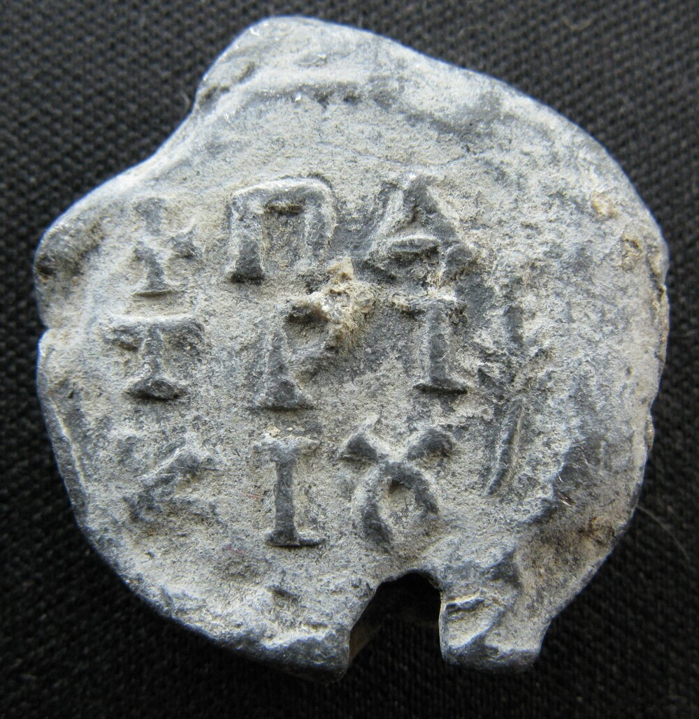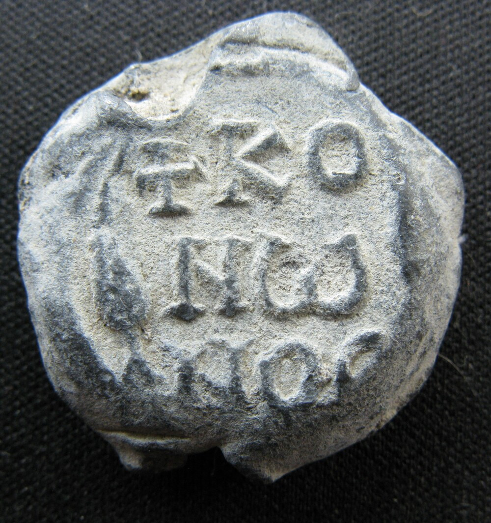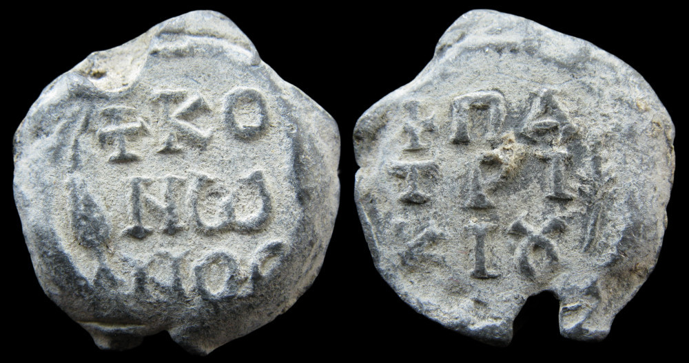 Sceau de grand module et d'un poids remarquable (15 g), attribuable au VIIIe siècle. La légende, répartie entre les deux faces et intégralement au génitif, se lit Κόνωνος πατρικίου — « de Kônôn, patrice ». L'encadrement par un cercle de feuillage sur chaque face est un élément décoratif fréquent dans la production sigillographique des VIIe–VIIIe siècles, associé aux bulles de haut rang.