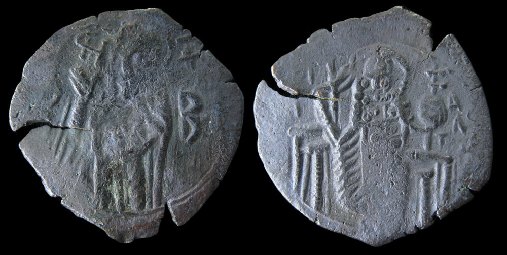 Ce trachy de bronze — ou trachy de billon très appauvri — a été frappé à Constantinople sous Michel VIII Paléologue, le restaurateur de l'Empire byzantin. Le droit présente la Vierge orante, debout et nimbée, protectrice par excellence de Constantinople. Ce choix iconographique est hautement significatif : c'est sous l'invocation de la Théotokos que Michel VIII reconquit la Ville en 1261, mettant fin à plus d'un demi-siècle d'occupation latine. La Vierge orante est ainsi le symbole même de la légitimité recouvrée de l'Empire restauré. Les lettres B – B dans le champ correspondent vraisemblablement à une marque d'officine ou un sigle monétaire.