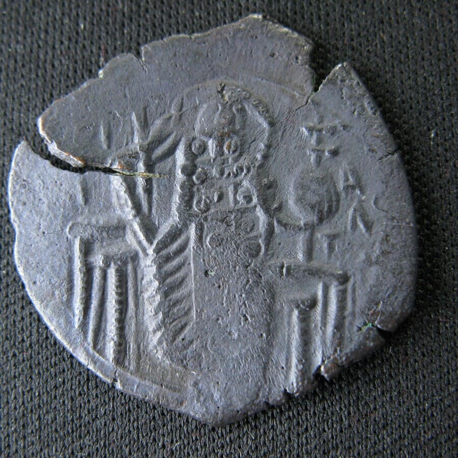 Exemplaire en bel état de conservation (Very Fine), avec une iconographie bien lisible sur les deux faces malgré la forme scyphate (concavo-convexe) caractéristique des trachea byzantins.
