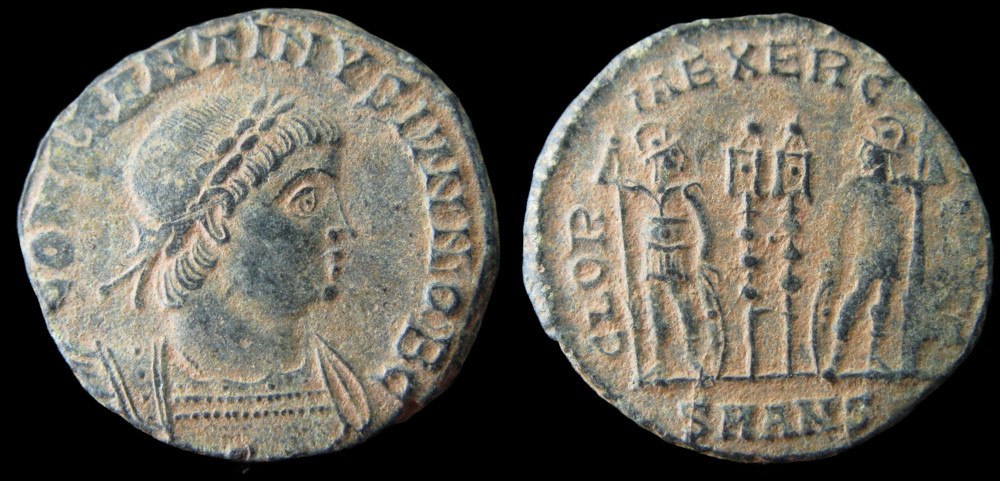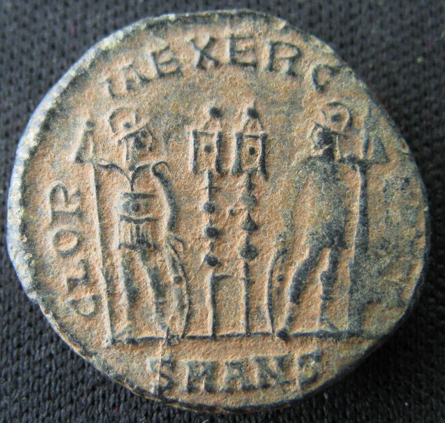 Cet Æ3 de Constantin II comme César illustre la propagande militaire constantinienne. Le revers GLORIA EXERCITVS à deux enseignes correspond à la première phase iconographique de ce type monétaire, introduite vers 330. Elle sera remplacée vers 335-336 par une version réduite à une seule enseigne. Le type célèbre la gloire de l'armée, pilier du pouvoir impérial, à travers la représentation de deux soldats encadrant les signa militaria, image classique de la virtus militaire romaine au IVe siècle.