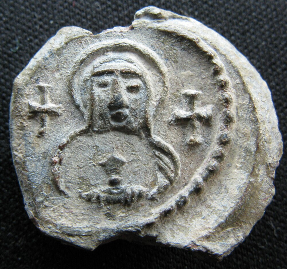 Sceau d'excellente qualité, remarquable par l'originalité de son style, empreint d'un archaïsme prononcé. Le droit présente un buste de la Vierge flanqué de deux croix, portant devant elle le médaillon du Christ — un type iconographique caractéristique de la période protobyzantine, qui préfigure les représentations mariales plus codifiées des siècles suivants.