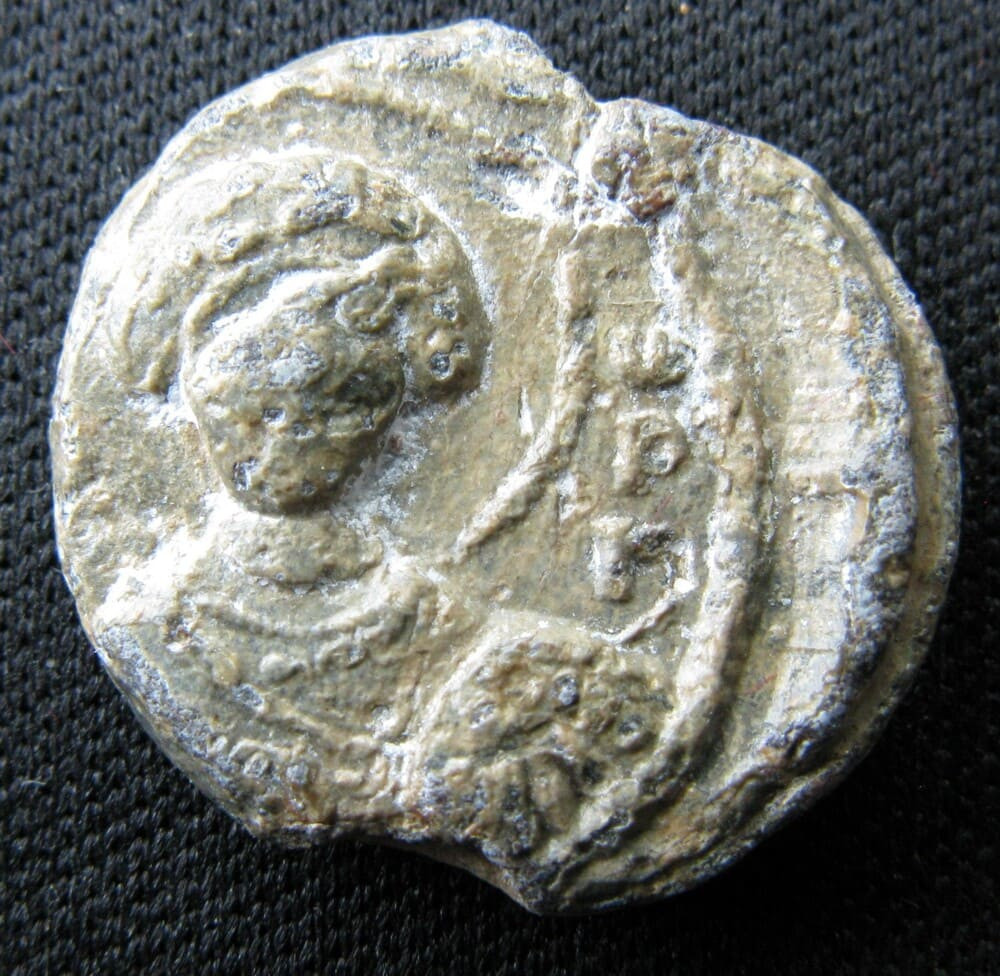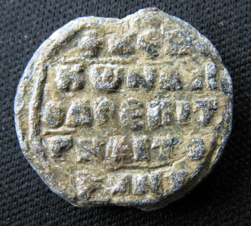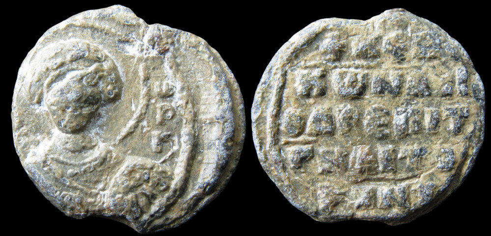 Sceau de Constantin Sarantapodès, protospathaire épi tou Chrysotriklinou, datable des Xᵉ-XIᵉ siècles. Le droit porte un buste de saint Georges armé d'une lance et d'un bouclier, saint militaire fréquemment invoqué par les dignitaires de la cour et les officiers byzantins.