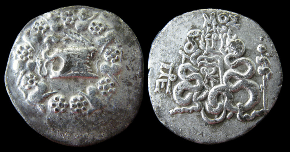 Tétradrachme cistophorique frappé à Pergame, en Mysie, vers 166-67 avant J.-C. Le cistophore est un monnayage d'argent typiquement micrasiatique, dont le nom dérive de la cista mystica représentée au droit — le panier sacré des mystères dionysiaques, d'où s'échappe un serpent. Ce type monétaire, commun à plusieurs cités d'Asie Mineure occidentale, fut introduit au début du IIᵉ siècle avant J.-C. et connut une diffusion considérable, devenant la monnaie d'argent de référence pour les échanges régionaux. Le standard pondéral du cistophore, d'environ 12,50 g pour un tétradrachme, s'inscrit dans un système distinct de l'étalon attique, adapté aux réalités économiques de l'Asie Mineure hellénistique.
