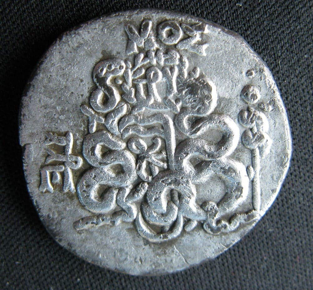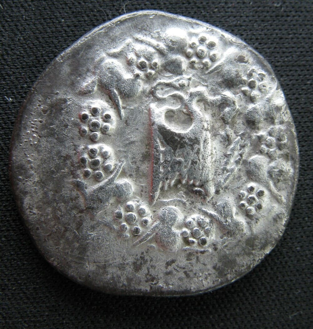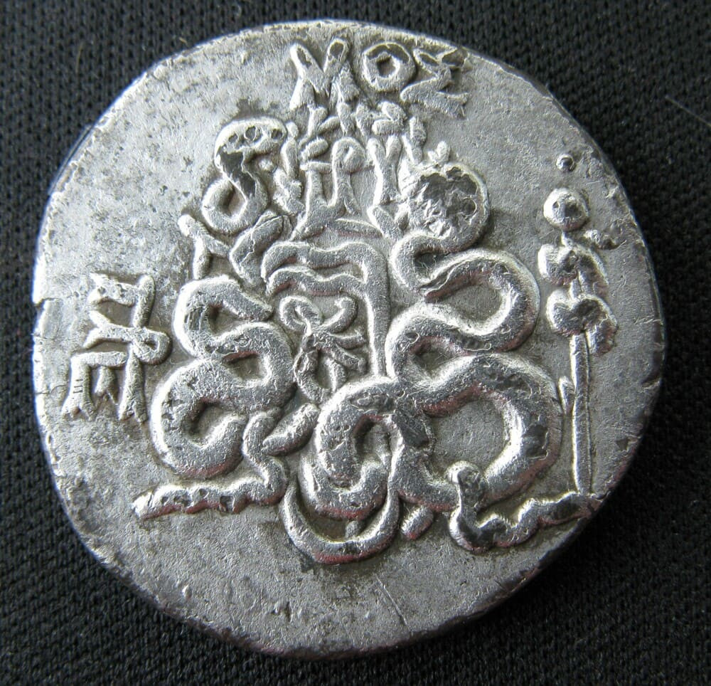 Le revers, avec son goryte flanqué de deux serpents dressés, prolonge le registre dionysiaque du droit. Le bâton enroulé d'un serpent à droite constitue un attribut d'Asclépios, divinité tutélaire de Pergame, dont le sanctuaire — l'Asclépiéion — était l'un des plus célèbres du monde antique. Les monogrammes et la marque ΜΟΣ permettent d'identifier l'émission et les magistrats responsables de la frappe. Après la paix d'Apamée en 188 avant J.-C., le royaume de Pergame connut un essor économique considérable, dont ce monnayage abondant est le reflet direct.