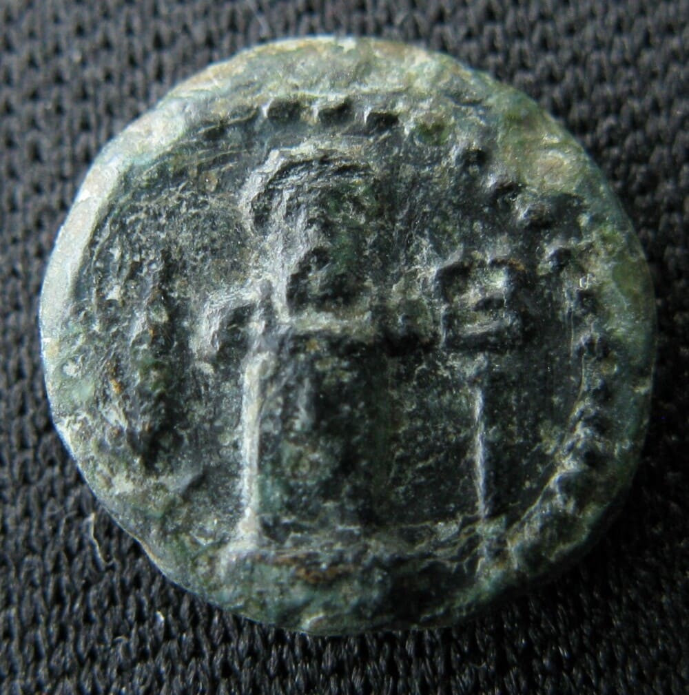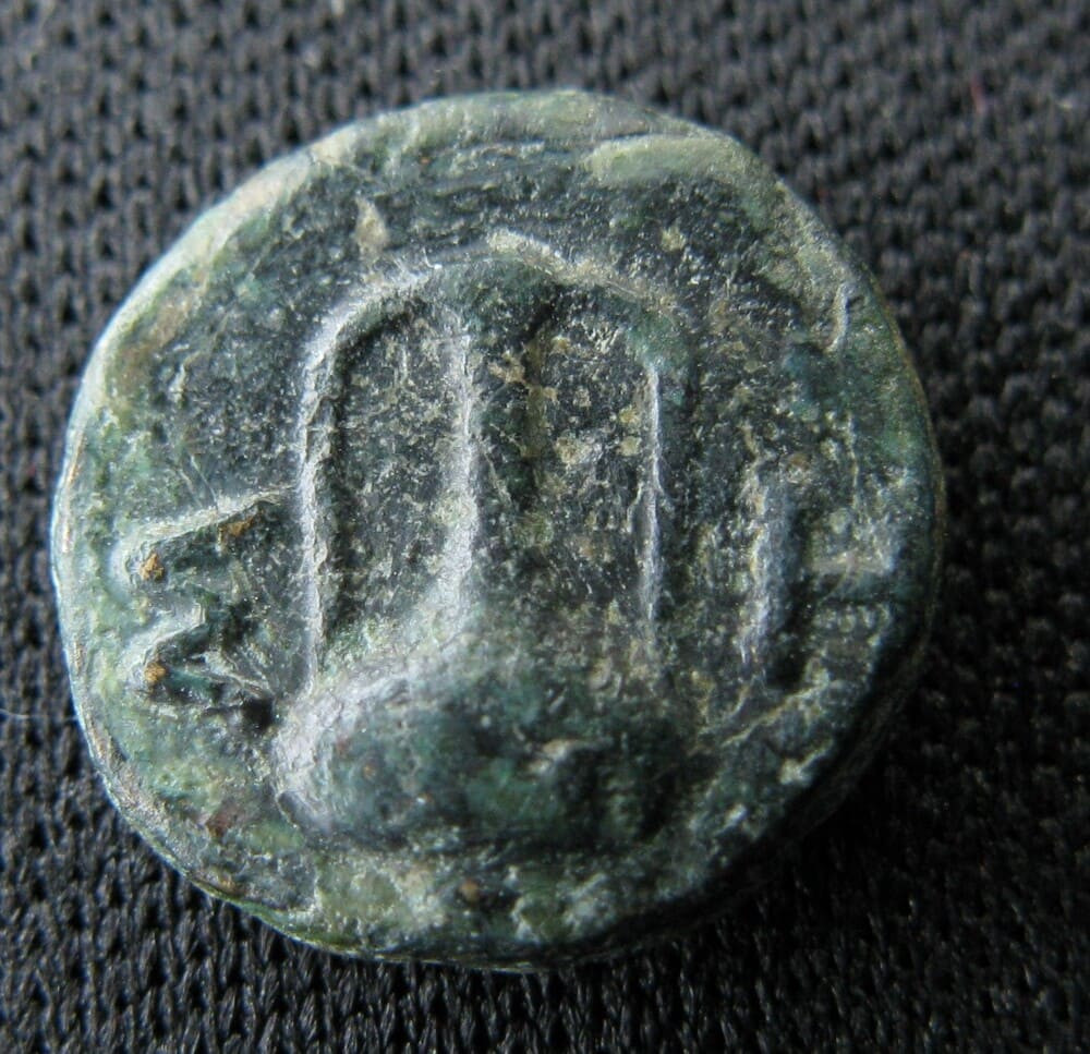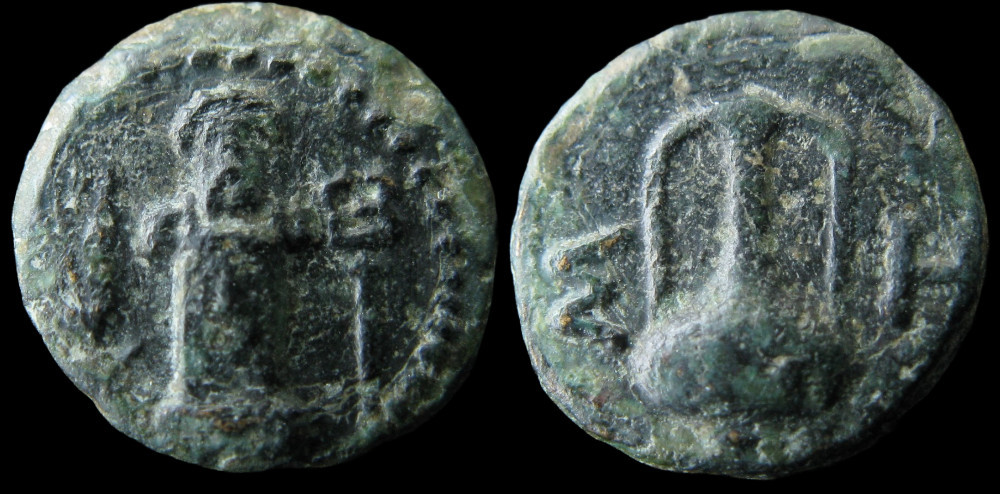 Bronze frappé à Sestos, en Thrace, vers 300 avant J.-C. Le droit présente un pilier hermaïque — représentation archaïque d'Hermès sous la forme d'un pilier surmonté d'une tête barbue — encadré par un épi de blé et un caducée. Ces trois éléments composent un programme iconographique cohérent : Hermès, dieu du commerce et protecteur des voyageurs, est associé à l'épi de blé, symbole de la richesse céréalière qui transitait par le détroit, et au caducée, son attribut traditionnel. Sestos, implantée sur la rive européenne de l'Hellespont (l'actuel détroit des Dardanelles), au point le plus étroit du passage, contrôlait l'une des voies commerciales les plus stratégiques du monde antique, par laquelle transitait une part considérable du blé pontique à destination de la Grèce.