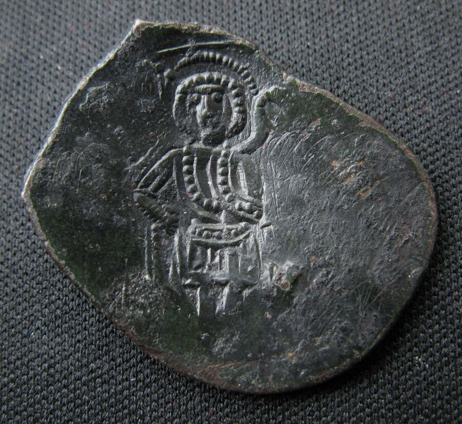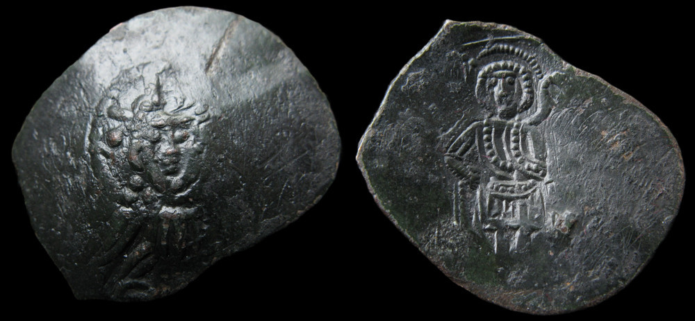 Trachy (monnaie concave) de grand module frappé à Constantinople sous les empereurs latins (1204-1261). Ce monnayage, émis après la prise de Constantinople par les croisés de la Quatrième Croisade en avril 1204, reprend délibérément les types et la forme du monnayage byzantin afin d'assurer la continuité de la circulation monétaire dans la capitale conquise. Le droit figure le buste du Christ bénissant — type christologique par excellence du monnayage de Constantinople —, tandis que le revers présente l'archange Michel, protecteur céleste de la cité et chef des armées angéliques, tenant le globe crucigère, symbole de la souveraineté universelle.