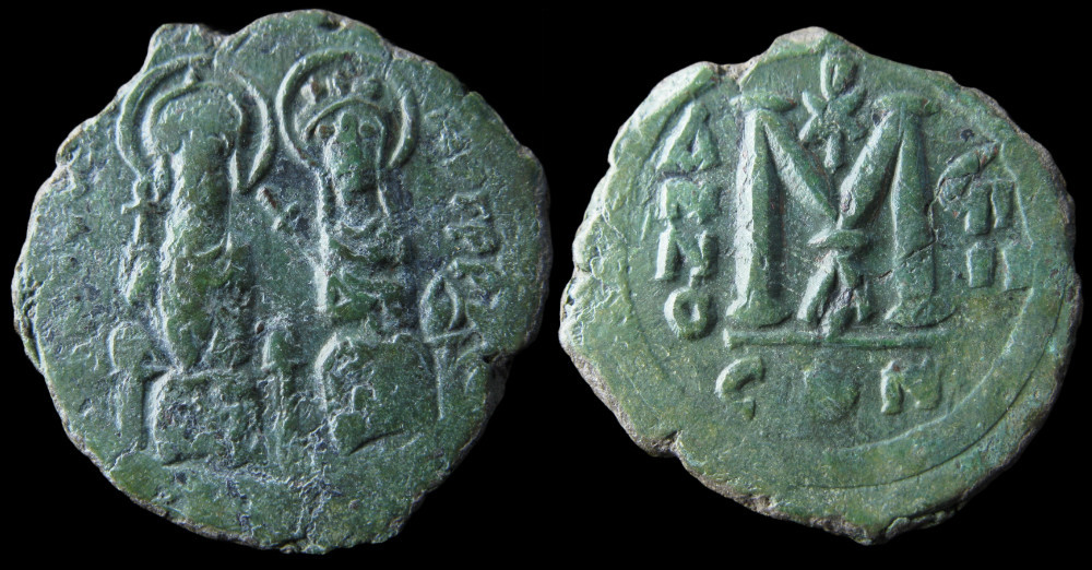 Follis (40 nummi) frappé à Constantinople, à la quatrième officine (Δ), sous le règne de Justin II et de son épouse Sophie (565-578)