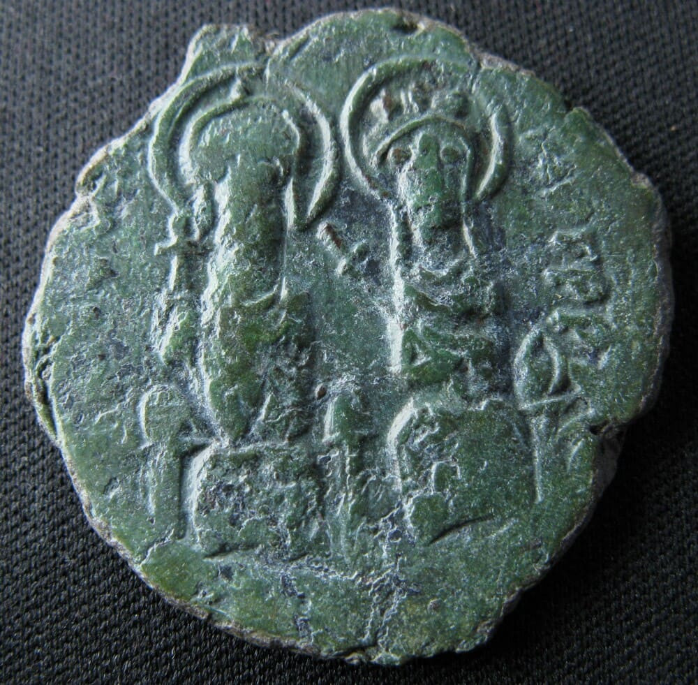 Follis (40 nummi) frappé à Constantinople, à la quatrième officine (Δ), sous le règne de Justin II et de son épouse Sophie (565-578). Le follis de Justin II est l'une des émissions les plus emblématiques du monnayage byzantin du VIᵉ siècle : pour la première fois, le droit représente le couple impérial conjointement, assis côte à côte sur un trône à double dossier en forme de lyre. Cette innovation iconographique témoigne du rôle politique considérable joué par l'impératrice Sophie, qui exerça de fait le pouvoir aux côtés — puis à la place — de son époux. Justin II tient le globe crucigère, insigne de la souveraineté universelle, tandis que Sophie porte le sceptre cruciforme, symbole de son autorité. Les deux figures sont nimbées, signe de la sacralité du pouvoir impérial.