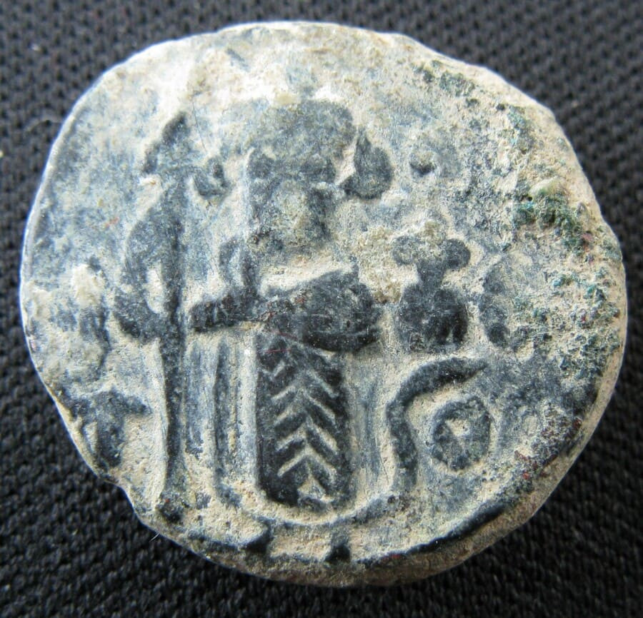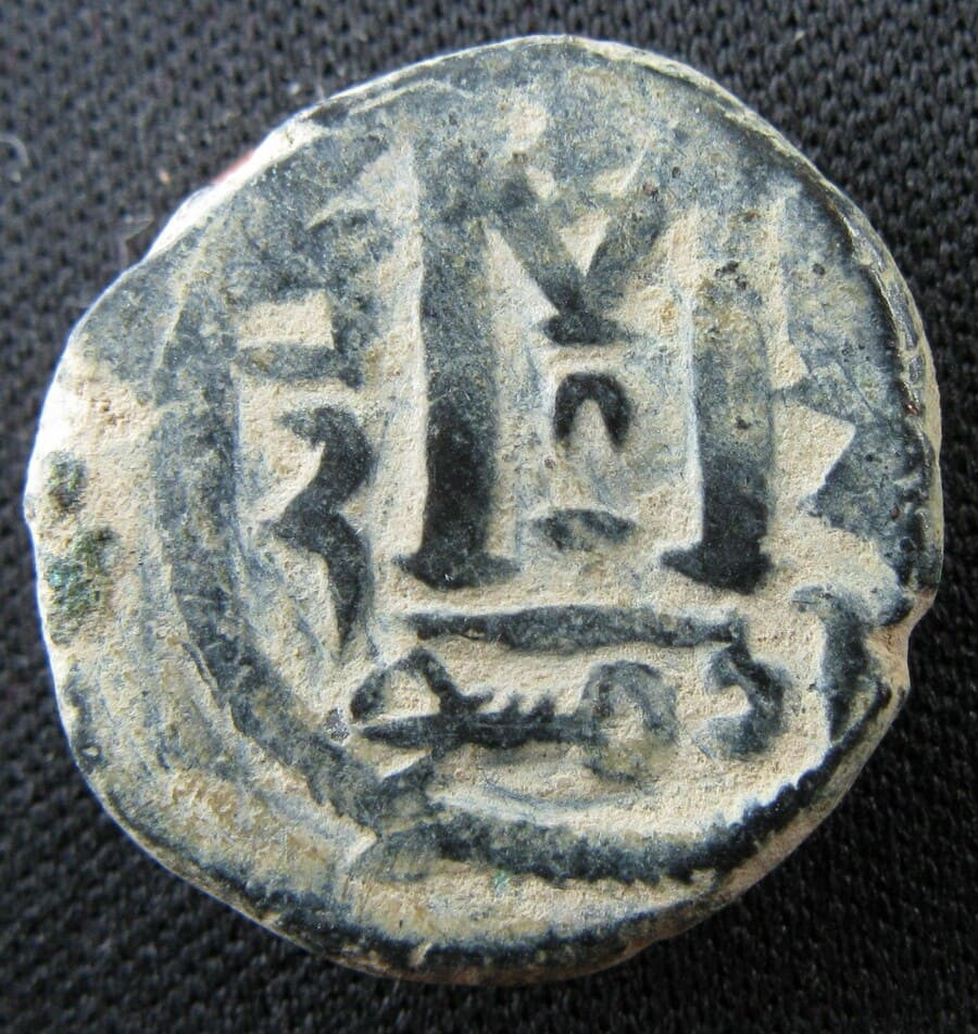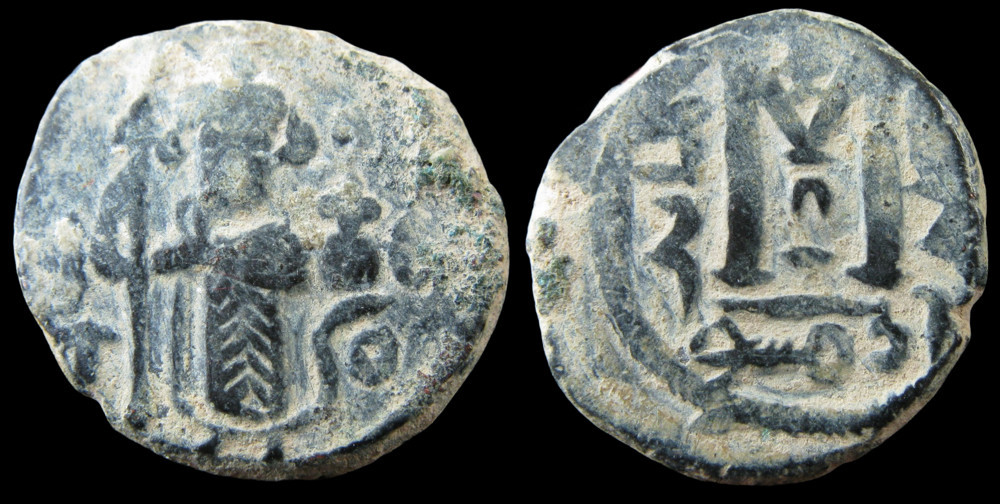Fals (follis) arabo-byzantin frappé à Damas dans la seconde moitié du VIIᵉ siècle, durant la période de transition entre la conquête arabe de la Syrie (634-638) et la grande réforme monétaire du calife omeyyade Abd al-Malik ibn Marwan (vers 696-697)