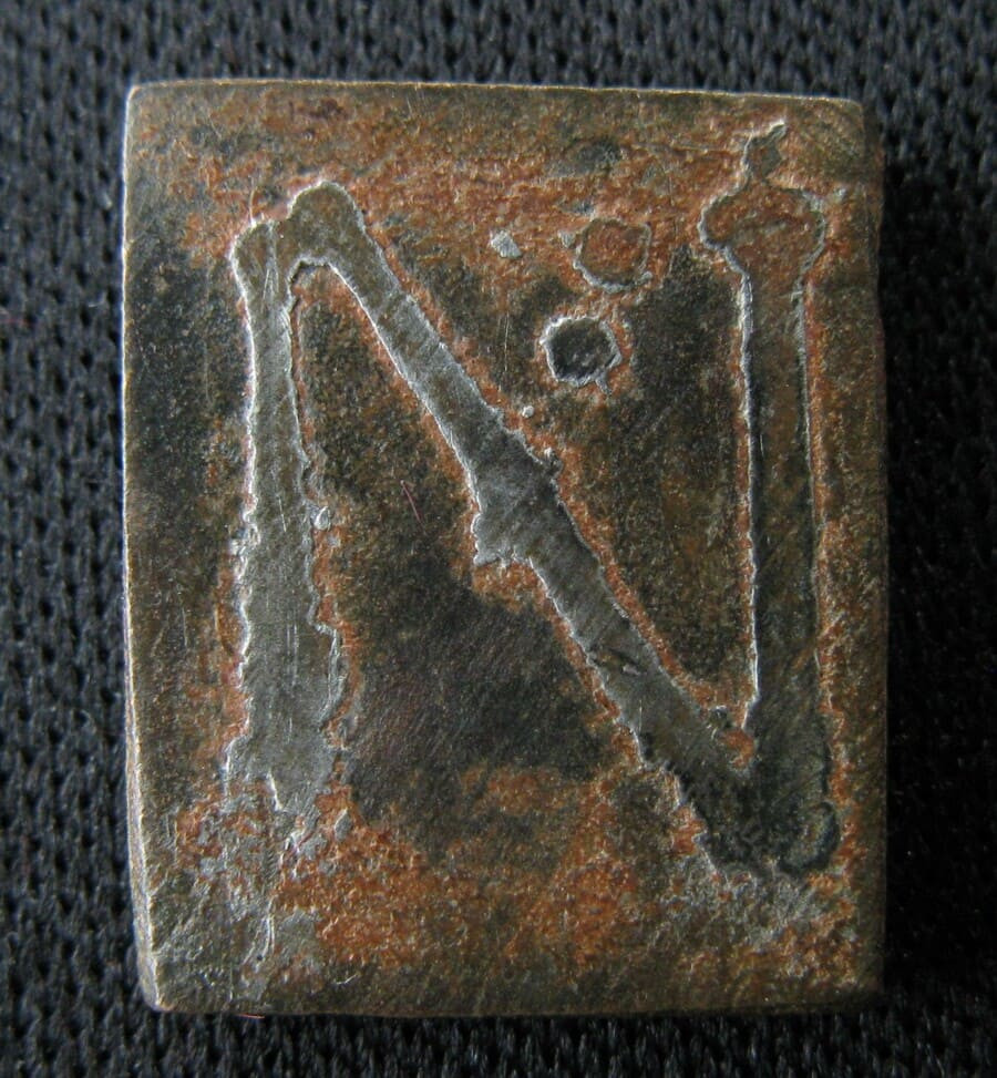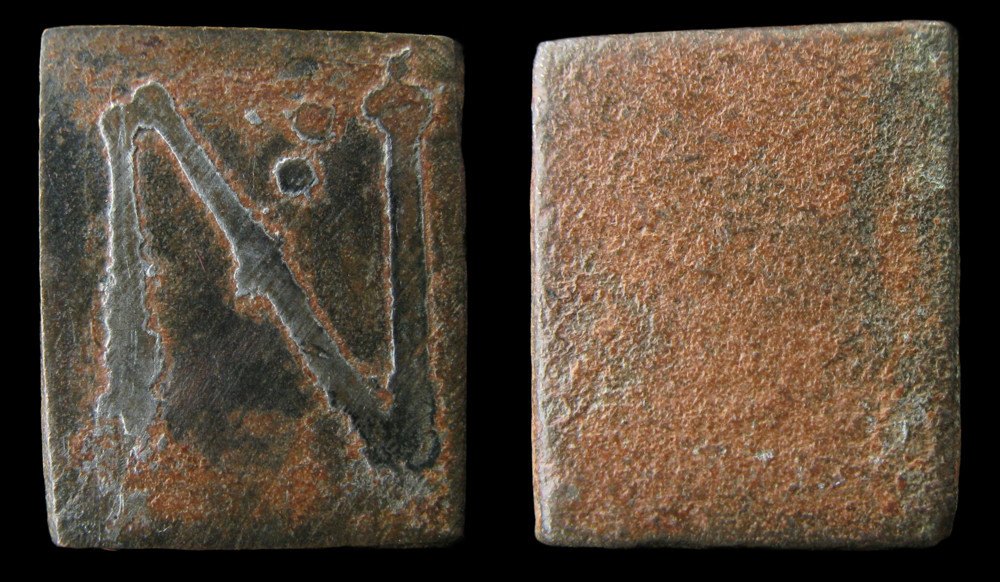 A/ Lettre N gravée, incrustée d'argent (?) ; deux marques de poinçon au-dessus.